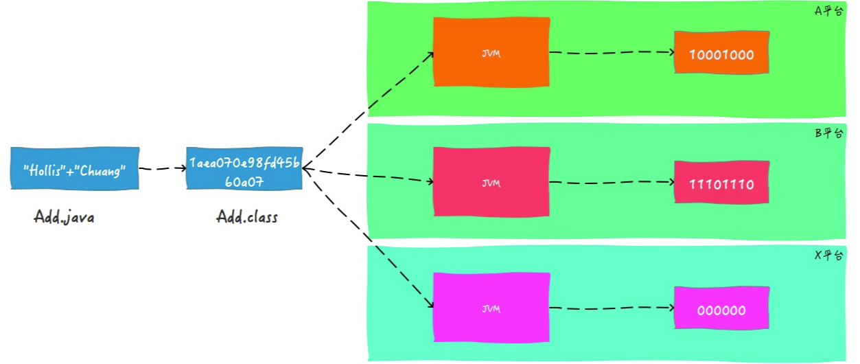 我们可以从这张图片(源自网络)清晰的看出,不同平台的JVM的解释方法是不一样的。但是他们最终执行结果是一样的