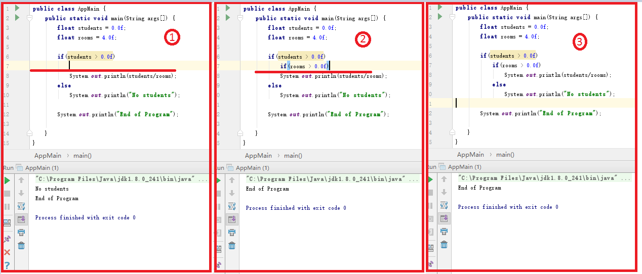 知道为什么图一跟图二为什么会有不同的执行结果吗? 原因在于 else 匹配了距离它最近的if, 也就是说图二等价于图三。要想避免这种情况发生,我们应该使用语句块“{}“。